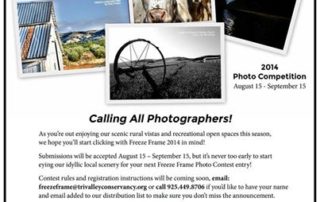 Calling all photographers! The Tri-Valley is ready for its close up! Enter the 2014 Freeze Frame TODAY. Enjoy the scenic rural vistas and gorgeous open spaces and capture it on camera for all to admire. Submit your BEST images via email to: freezeframe@trivalleyconservancy.org or call 925.449.8706 Hurry! Submissions must be in between August [...]